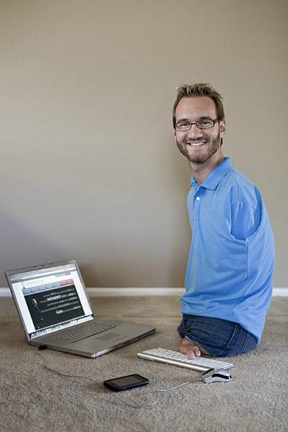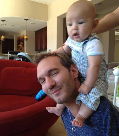 Nick è nato in Australia nel 1982 da un pastore e un’infermiera e  con una rara malattia genetica: la tetramelia. Non ha nè braccia nè gambe, ha  un piccolo piede con due dita.