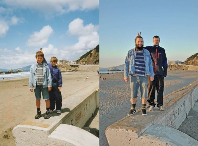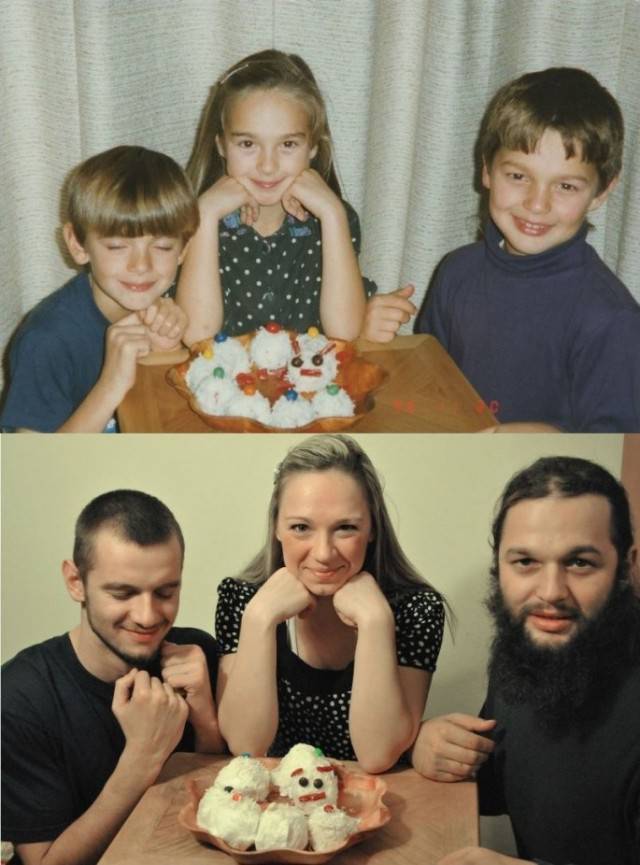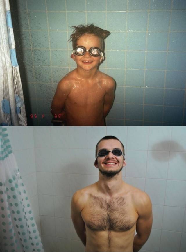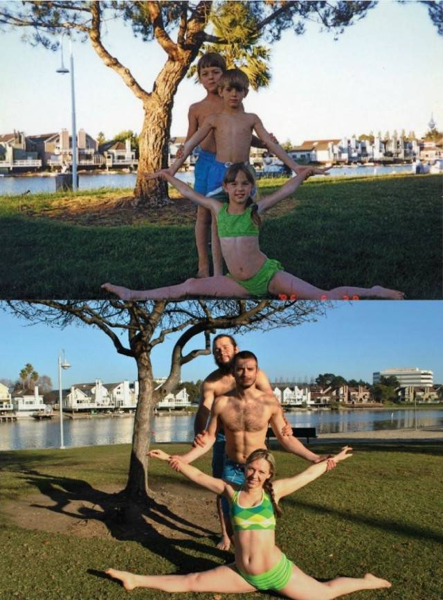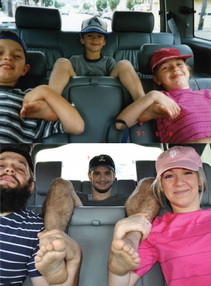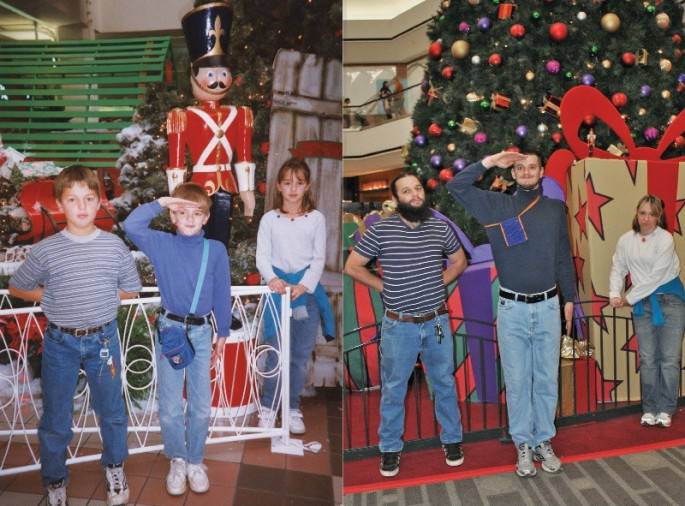 Ultimamente si è diffusa una nuova “moda fotografica“, quella di riprodurre le immagini di quando si era bambini, nelle esatte pose, ma da adulti.