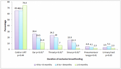 Uno studio sui bambini americani, per esempio, ha puntato a esaminare le differenze di rischio di infezione, fino ai 6 anni di età, tra quelli che erano stati allattati al seno e quelli che lo erano stati in via esclusiva.