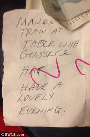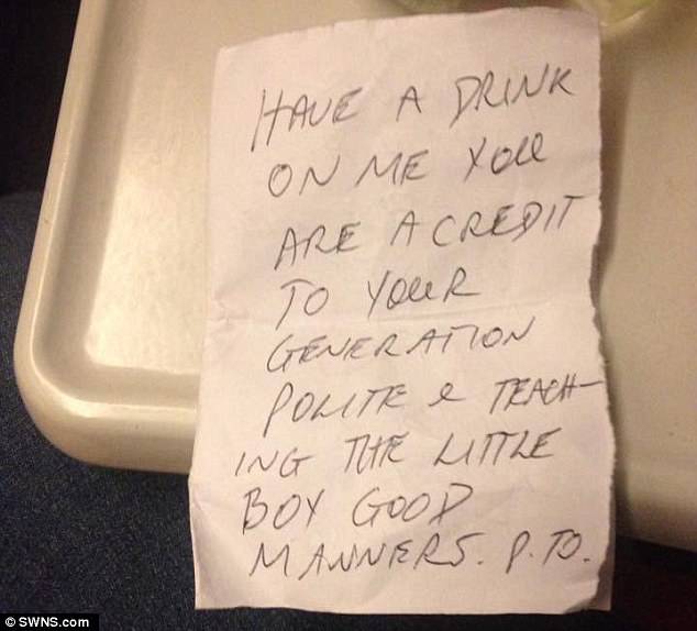“Bevi un drink alla mia salute. Sei un vanto per la tua generazione, perché educata e stai insegnando le buone maniere a tuo figlio. L’uomo sul treno a tavola con gli occhiali e il cappello. P.S. Ho una figlia della tua età, qualcuno ha fatto lo stesso con lei una volta. Spero che quando avrà figli sarà una buona madre come te”