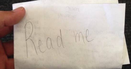 Un utente di Reddit in partenza dall’aeroporto di San Francisco ha trovato questa missiva appoggiata su un sedile con la scritta: READ ME, ossia leggimi e con un braccialetto.