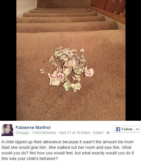Di recente, la mamma Fabienne Marthold ha postato un interessante interrogativo su Facebook, chiedendo alle “colleghe” cosa avrebbero fatto se il loro bimbo avesse ridotto in briciole i soldi che gli avevate dato perché non era la somma pattuita.