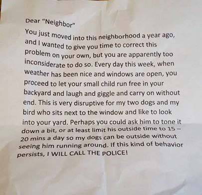 “Cara vicina ti sei trasferita nel vicinato solo un anno fa e ti ho voluto dare il tempo per correggere il problema da te, ma probabilmente sei troppo sconsiderata per farlo. Ogni giorno, questa settimana, quando il tempo era bello e le finestre aperte hai lasciato il tuo bambino correre libero nel cortile ridendo, facendo versi e andando avanti all’infinito. Questo disturba enormemente i miei cani e il mio uccellino che siedono vicino alla finestra e a cui piace dare un’occhiata nel tuo giardino. Forse potresti dirgli di abbassare un po’ il volume o limitare il tempo fuori a 15, 20 minuti, così i miei cani potrebbero stare fuori senza vederlo correre intorno. Se però persisterà in questo comportamento sarò costretto a CHIAMARE LA POLIZIA“.
