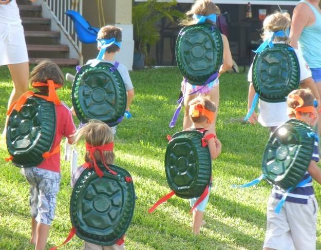 17. Prendete delle vaschette, dipingetele di verde se necessario, basta questo e delle strisce di stoffa colorata per avere l’ultima serie di super costumi delle mitiche Tartarughe Ninjaa.