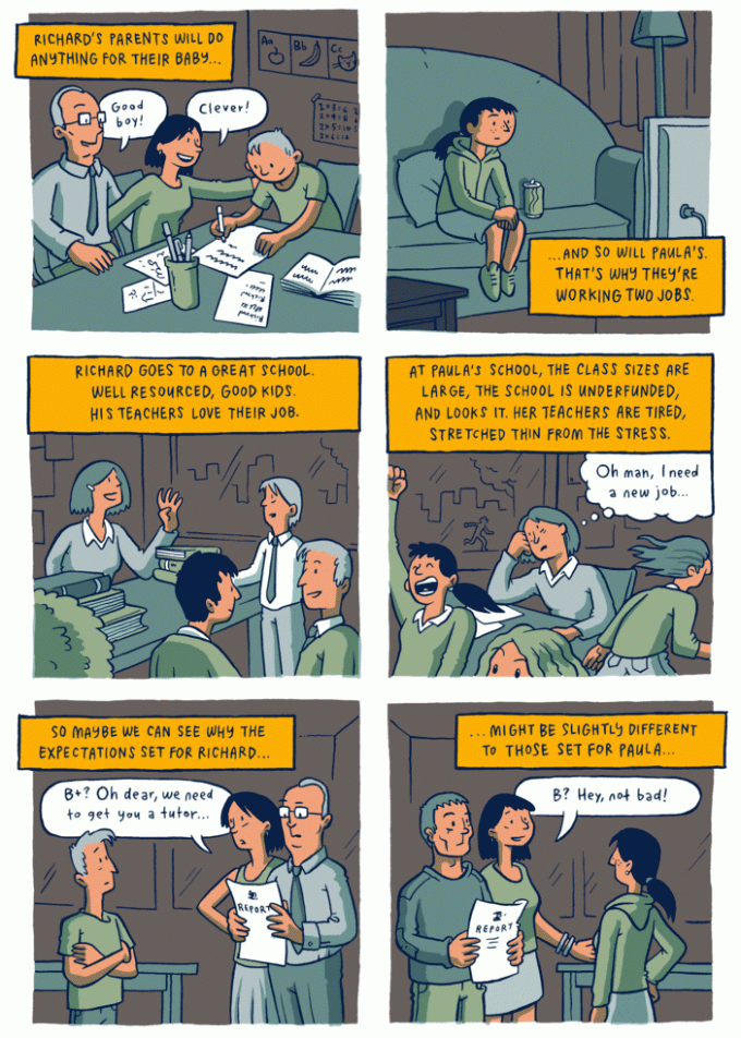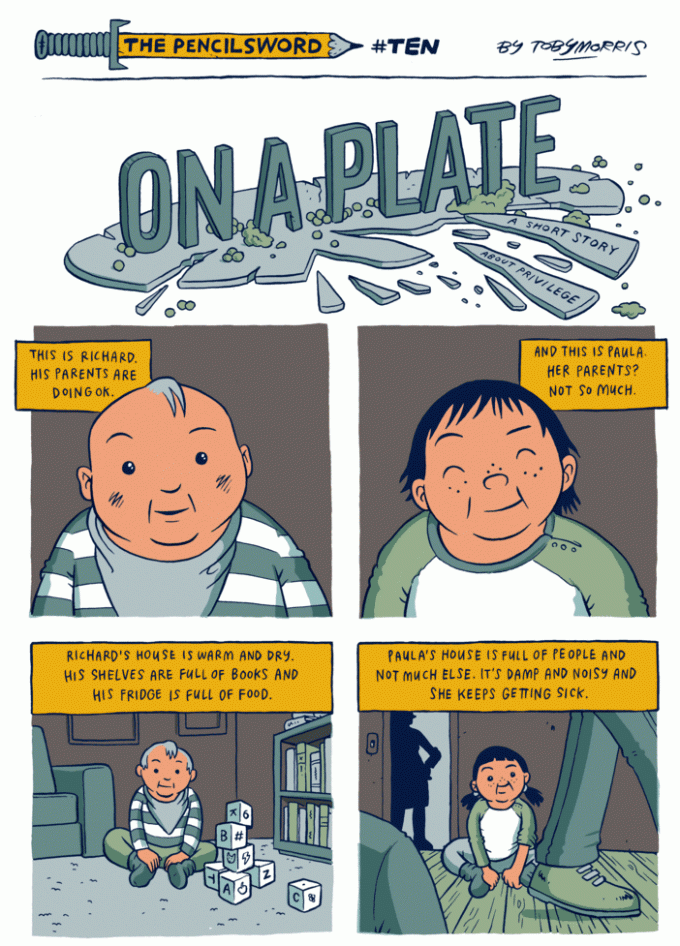 Nella sua opera: “Sul piatto: una breve storia di privilegio” il vignettista ha immaginato la storia di Paula, una ragazza che, nata da genitori non benestanti, ha dovuto affrontare aule affollate, insegnanti stressati mentre il suo omologo Richard invece aveva tutte le opportunità date da una famiglia ricca.