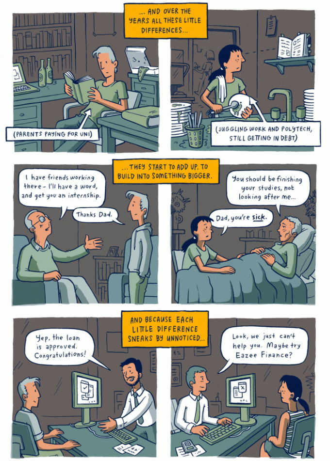 Sarà per questo che il vignettista Toby Morris ha deciso di tradurre sul The Wireless.co.nz le battute di arresto di una persona nata nella povertà rispetto ai coetanei benestanti in vignette.