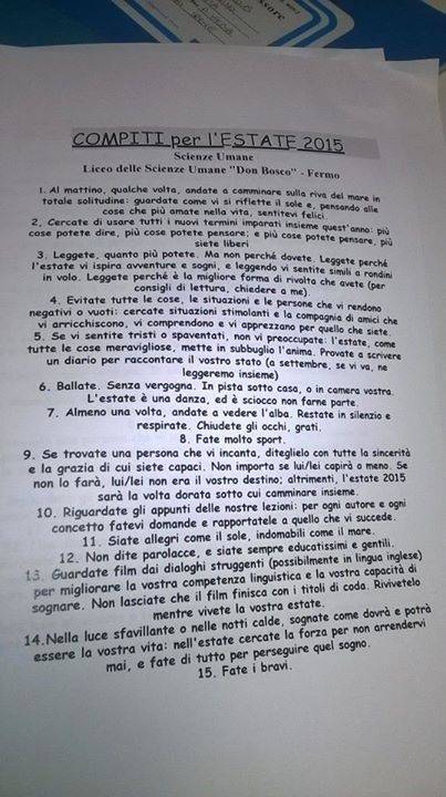 Firmata dal professor Cesare Catà, insegnante al Liceo delle Scienze Umane “Don Bosco” di Fermo, questi suggerisce agli alunni di passeggiare all’alba sul mare, pensare al futuro, leggere perché “è la migliore forma di rivolta che avete”.