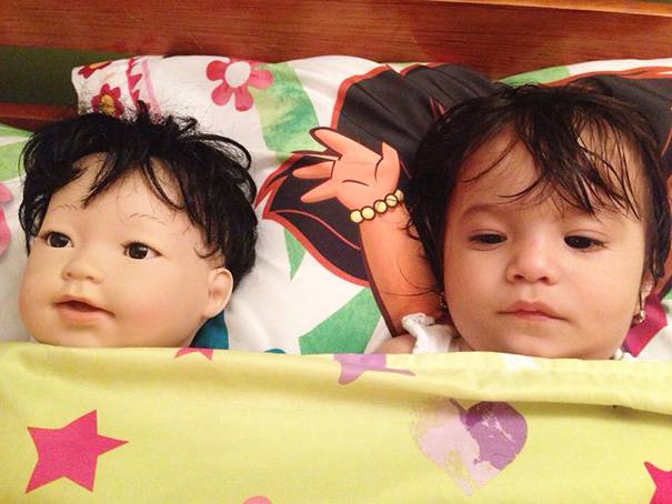 Guardando queste bambine e le loro bambole non potrete fare a meno di trattenere un sorriso. Le piccole infatti somigliano in modo impressionante alle loro “sosia” di gomma, di pezza o plastica.