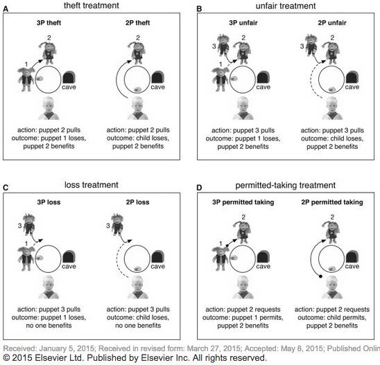 In particolar modo in un esperimento in cui un pupazzo “rubava” un biscotto, i bambini di 3 e 5 anni hanno provato a ritornarlo al suo legittimo proprietario. E lo hanno fatto anche quando il biscotto veniva preso a loro o a qualcun altro, incluso il pupazzo.