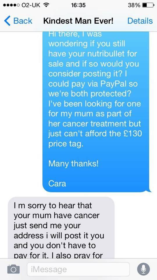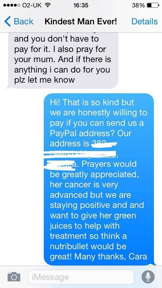 “Grazie, sei molto gentile ma siamo disposti a pagare. Puoi darci un indirizzo per la Paypal? Apprezziamo molto le preghiere, il suo cancro è molto avanzato ma siamo positivi e vogliamo darle succhi di frutta per aiutarla con le cure, quindi pensiamo che un Nutribullet sia fantastico. Grazie mille”.