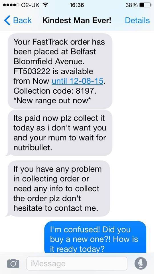 “Il tuo ordine prioritario si trova in Bloomfield Avenue a Belfast […] è già pagato per favore vai a prenderlo oggi non voglio che tu e la tua mamma dobbiate aspettare per il Nutribullet. Se hai qualche problema per ritirarlo o hai bisogno di info per favore non esitare a contattarmi”.