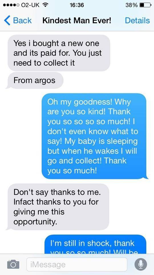 “Oh Mio Dio, sei stato davvero gentile. Non so nemmeno cosa dire. Il mio bambino sta dormendo ma non appena si sveglia andrò a ritirarlo. Grazie mille”.