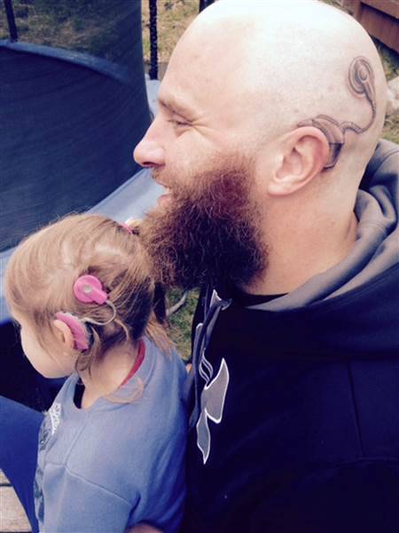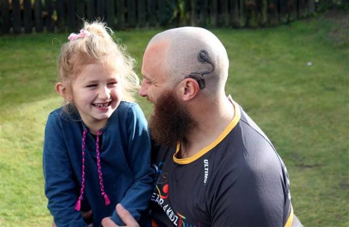 Alistair Campbell, padre di una bambina di 3 anni, si è fatto tatuare un impianto cocleare sull’orecchio sinistro per fare il paio con quello vero indossato dalla figlia Charlotte.