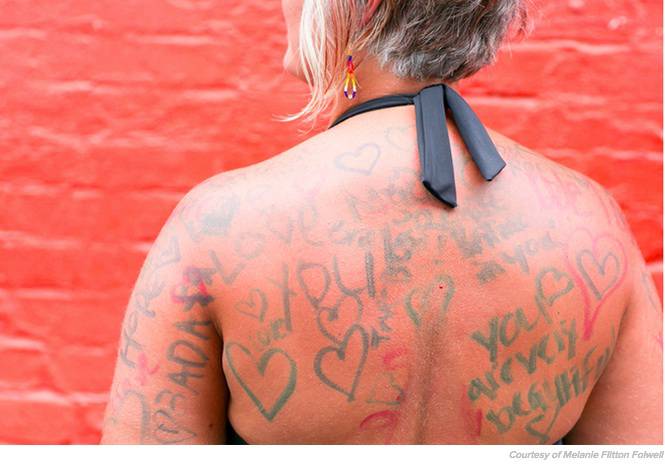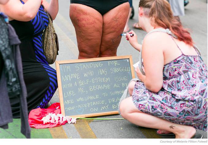 Ispirata da un’idea di un gruppo australiano chiamato Liberators International, che aveva svolto un esperimento simile a Londra, Amy si è presentata in un mercato affollato di Boise, Idaho. Si è tolta i vestiti ed è rimasta in bikini; si è bendata e ha lasciato che le persone le lasciassero un messaggio sul corpo. Ai suoi piedi un cartello con la scritta: “Sono qui per tutti coloro che hanno combattuto con l’autostima, come ho fatto io, perché ogni corpo è prezioso. Per supportare l’autoaccettazione, disegna un CUORE sul mio corpo“.