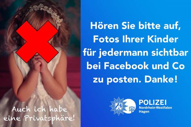 «Ascoltateci, prima di pubblicare le foto dei vostri bambini su Facebook, che possono essere viste da tutti, ricordatevi che anche i bambini hanno diritto alla privacy. Un’istantanea in spiaggia nudi o il bagno nella piscina per bambini: molti di voi pubblicano foto dei loro piccoli su Facebook. E spesso sono visibili a tutti, perché vengono pubblicate senza alcuna attenzione alle Impostazione per la privacy. Forse oggi troverete queste immagini dolci, ma a lungo andare potrebbero diventare imbarazzanti per i vostri bambini. Potrebbero essere soggetti a bullismo. O peggio: i pedofili sono inclini a fare uso di tali foto e le usano per i propri scopi o le pubblicano altrove. Anche i bambini hanno una vita privata. Perché Internet non ‘dimentica’ nulla». Il post si conclude, poi, in questo modo: «Molto meglio mostrare le foto dei vostri piccoli alla nonna, il nonno, la zia, lo zio, gli amici e i conoscenti personalmente, è più bello poterne parlare e sorridere insieme». Anche la foto postata è molto eloquente, si vede una bimba con il volto coperto da una X rossa con la didascalia «Anch’io ho una sfera privata».