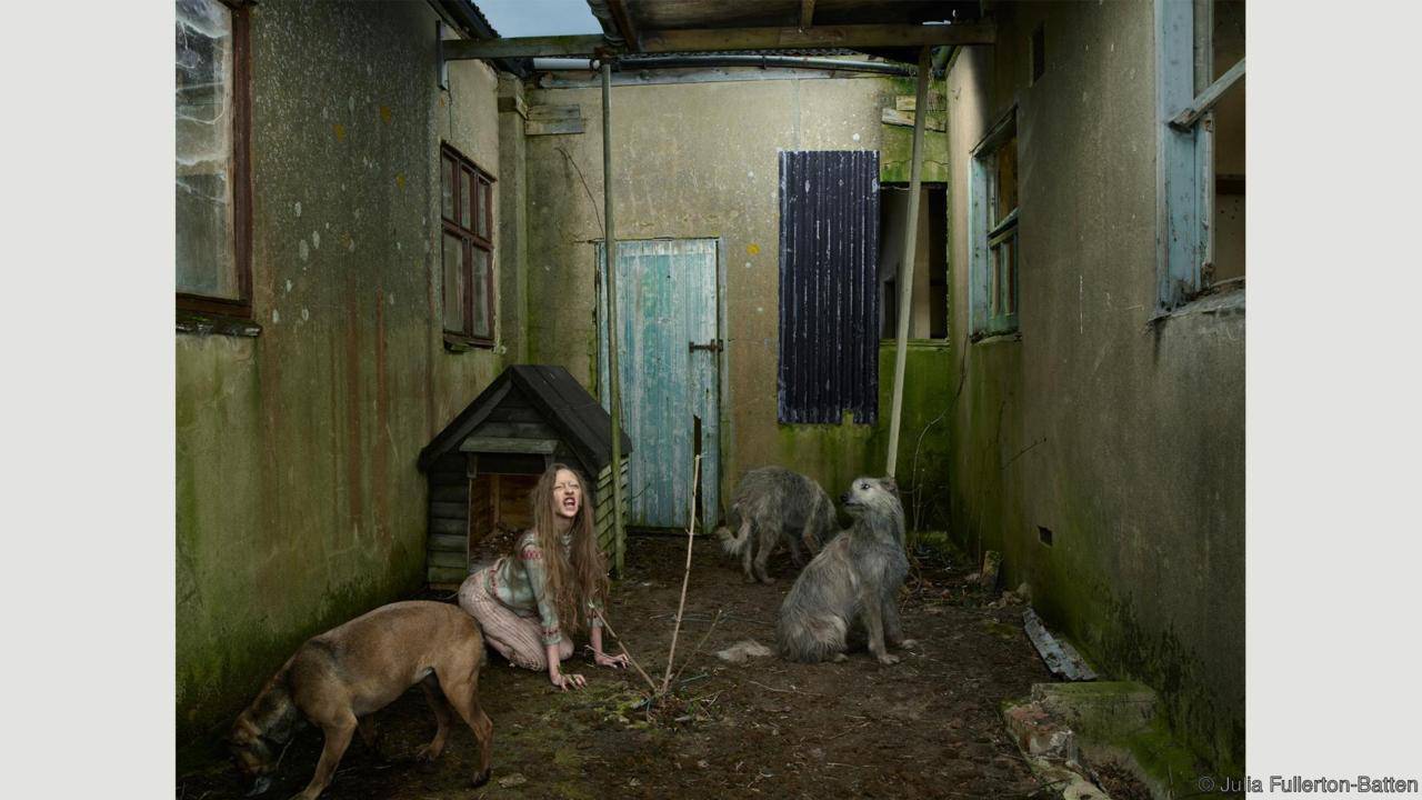 Questa foto ricrea il caso della ragazza ucraiana Oxana Malaya (1991). “Oxana è stata scoperta a vivere con i cani, in una cuccia. Aveva 8 anni e viveva coi cani da 6. I suoi genitori erano alcolizzati e una sera l’hanno lasciata fuori di casa. In cerca di calore la bimba di 3 anni è strisciata nella cuccia della fattoria e si è raggomitolata con i cani meticci, un gesto che probabilmente le ha salvato la vita. Correva a 4 zampe, con la lingua di fuori, a causa della mancanza di interazione umana conosce solo le parole sì e no”. Oxana ora vive in una clinica a Odessa lavorando con gli animali della fattoria.