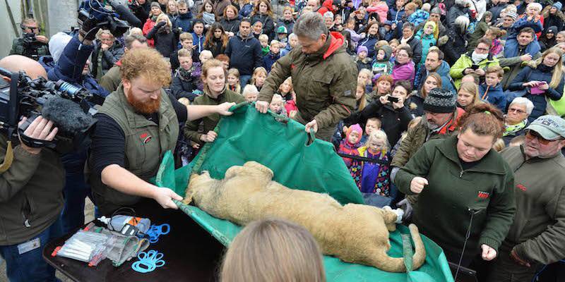 In uno zoo danese è stato dissezionato pubblicamente il cucciolo di un leone di un anno. Il leoncino è stato ucciso circa nove mesi fa, il motivo ufficiale è perché la struttura ospita troppi felini e non si vuole favorire l’accoppiamento tra consanguinei. È stato tenuto in una cella frigorifera tutto questo tempo in previsione dell’autopsia pubblica, fatta in prossimità delle vacanze di autunno presenti negli istituti scolastici danesi.