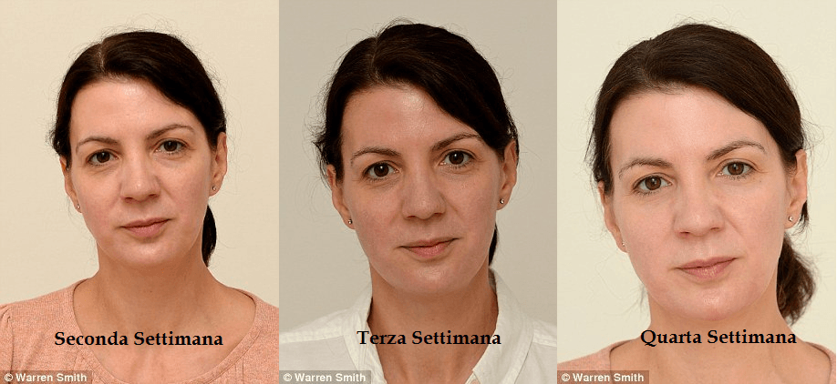 Per documentare il suo impegno Sara ha fatto una foto del suo viso ogni settimana, i risultati già solo dopo 4 settimane è davvero stupefacente. La stessa Sara, un po’ incredula ma soddisfatta, ha dichiarato al Daily Mail: «La fotografia scattata il giorno in cui ho iniziato questo esperimento, dimostra perfettamente, e spaventosamente, cosa fa la disidratazione al viso. Ho 42 anni, ma devo ammettere che nella foto ne dimostro 52. Ci sono ombre scure sotto e intorno agli occhi che mi fanno sembrare esausta, rughe ovunque e strani rossori.