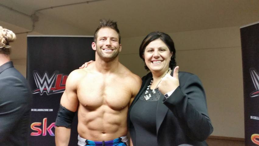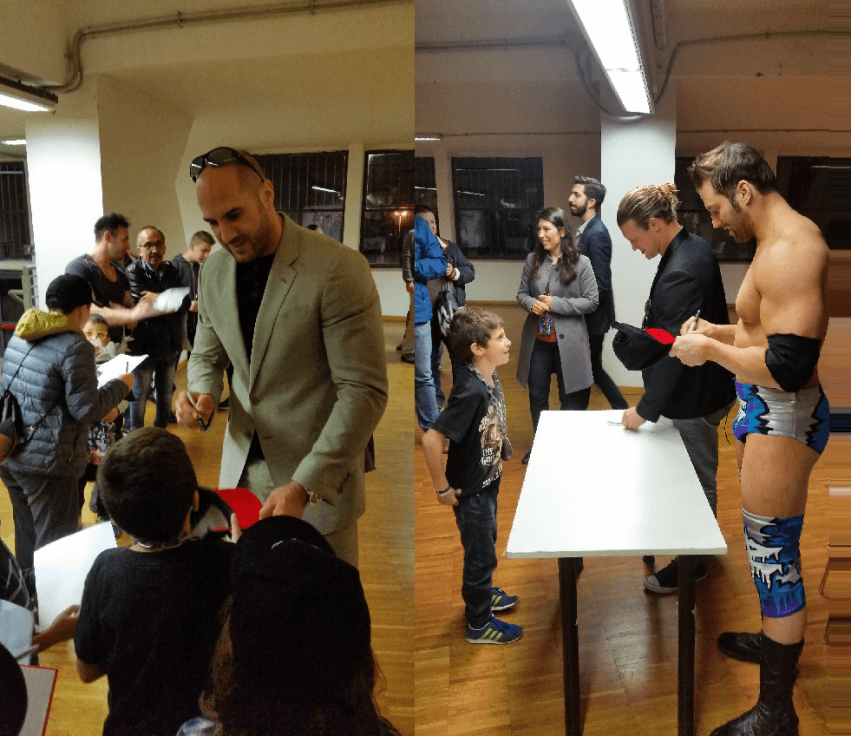 Finalmente è arrivato il momento di incontrare i campioni, le Superstars…i miei figli, gli altri bimbi e anche noi adulti eravamo davvero emozionati. Il primo ad entrare, accolto dagli applausi, è stato il mitico Cesaro che ha “battuto il 5” con i piccoli e ha poi iniziato a fare autografi e foto. Poi sono arrivati Zack Ryder, già in abito da scena, e Dolph Ziggler, che oltre a fare autografi e foto con noi tutti, hanno scherzato con i più piccoli.