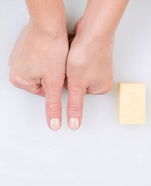 la misura è 30 gr di formaggio, lunghezza e profondità dei vostri due pollici. Queste sono 125 calorie che vi danno 1/3 del bisogno di calcio al giorno.