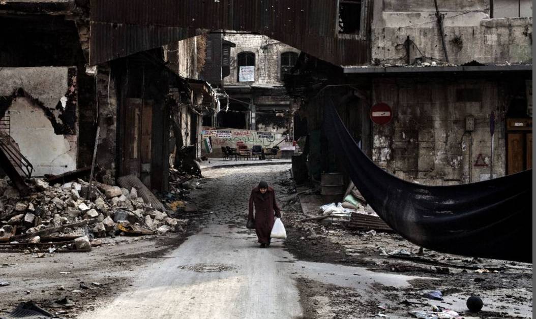 Un’anziana in una strada di Aleppo, in Siria. Il telo nero dovrebbe delimitare l’area dove sparano i cecchini governativi.