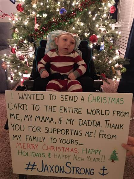 I genitori hanno creato una pagina su Facebook per tenere aggiornati amici, parenti e sostenitori e sulla quale scrivono i recenti avvenimenti che li riguardano: “Jaxon ha avuto uno dei suoi giorni migliori, è stato di buon umore per tutto il tempo ed è andato a incontrare Babbo Natale per la prima volta”.