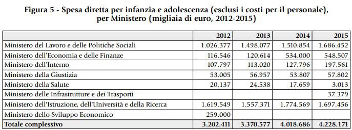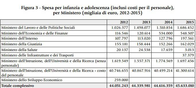 Inoltre “è importante notare come il Fondo Nazionale per l’Infanzia e l’Adolescenza sia andato progressivamente a ridursi nel periodo considerato, passando da una dotazione di circa 40 milioni nel 2012 e 2013, ai 30,7 milioni del 2014 e arrivando a 28,7 milioni nel 2015”.