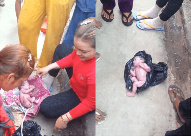 Dalle immagini si vede un gruppo di uomini e donne che hanno trovato un sacco della spazzatura a lato della strada. Aprendolo scoprono che all’interno vi è un neonato, con ancora il cordone ombelicale attaccato alla placenta.