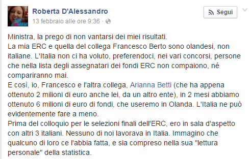 Roberta D’Alessandro, che vive e lavora in Olanda ha voluto sfogarsi sulla sua pagina indirizzandosi alla ministra dell’Istruzione che si vantata per il successo degli italiani in un prestigioso bando dell’European Reasearch Council.