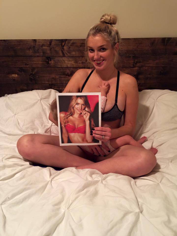 La donna non si è arresa e ha deciso di proporre sulla sua pagina Facebook un’altra immagine coprendo però i seni con la foto di una delle note modelle di Victoria’s Secret, la nota marca di Lingerie.