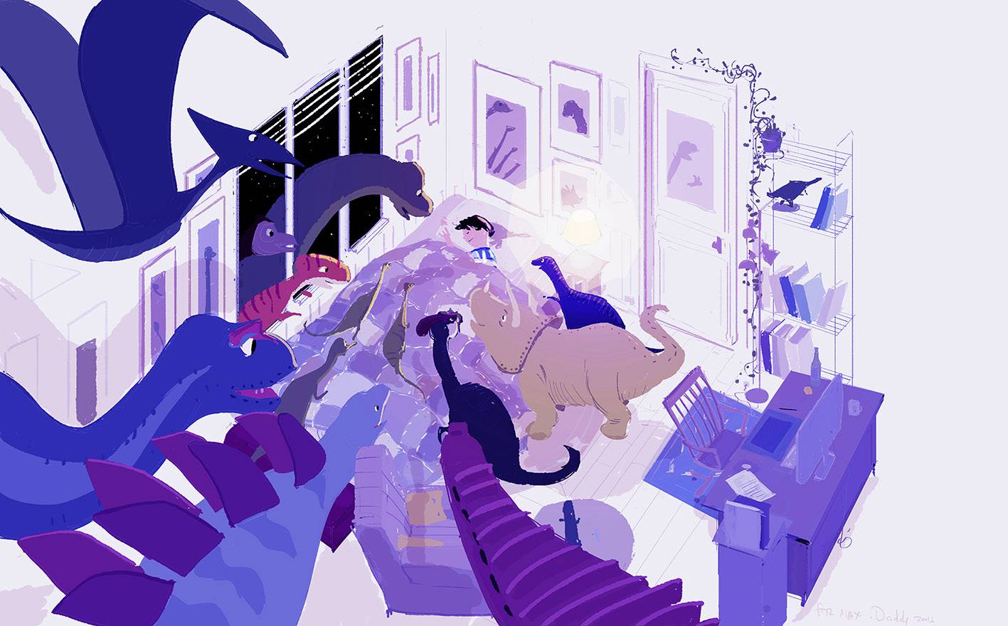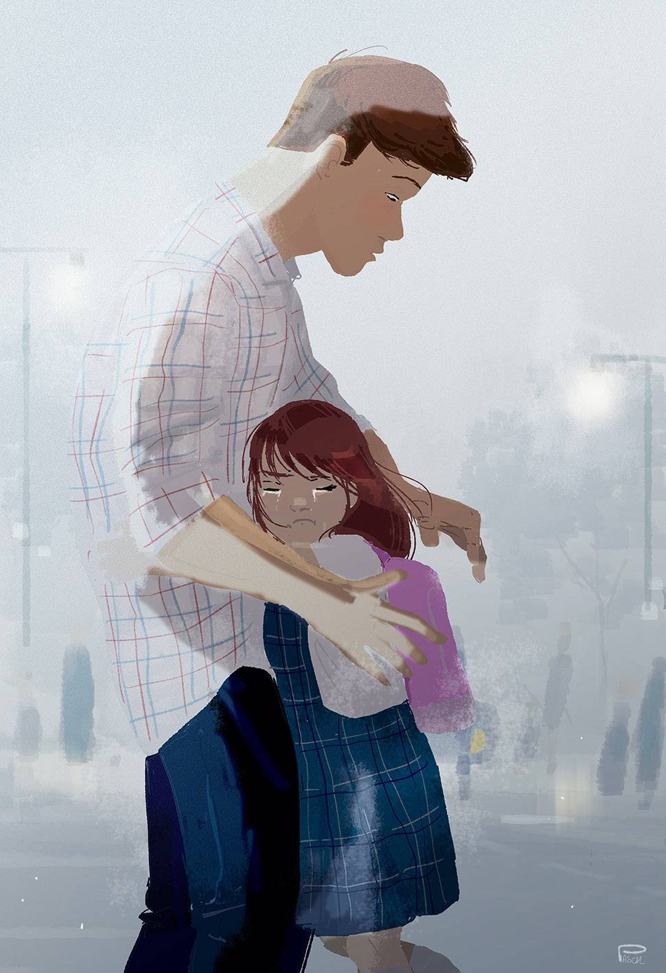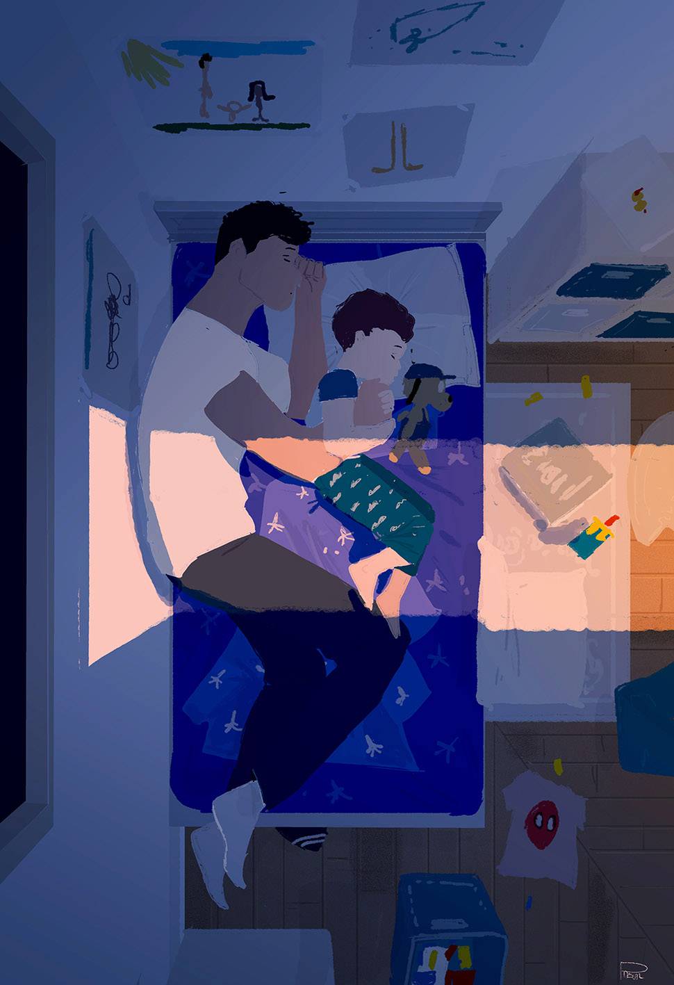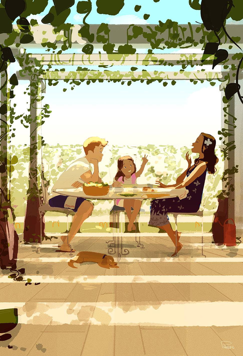 Prima di avere una moglie e dei figli, la mia vita sarebbe stata consumata da disegno e lavoro (stavo lavorando come regista di spot pubblicitari: tante ore, rapidità, alta qualità del lavoro, etc). Dopo aver avuto dei figli, è diventato molto difficile focalizzarsi tanto sul lavoro. Non solo a causa del tempo, ma anche perché non c’era più lo stesso interesse. Non mi importava più così tanto di spot e anche il mio gusto in fatto di film, musica e arte è cambiato. Tutto ad un tratto, i miei disegni sono diventato su mia figlia e mia moglie, temi che non avrei necessariamente disegnato prima semplicemente perché non avevo un legame particolare con loro.