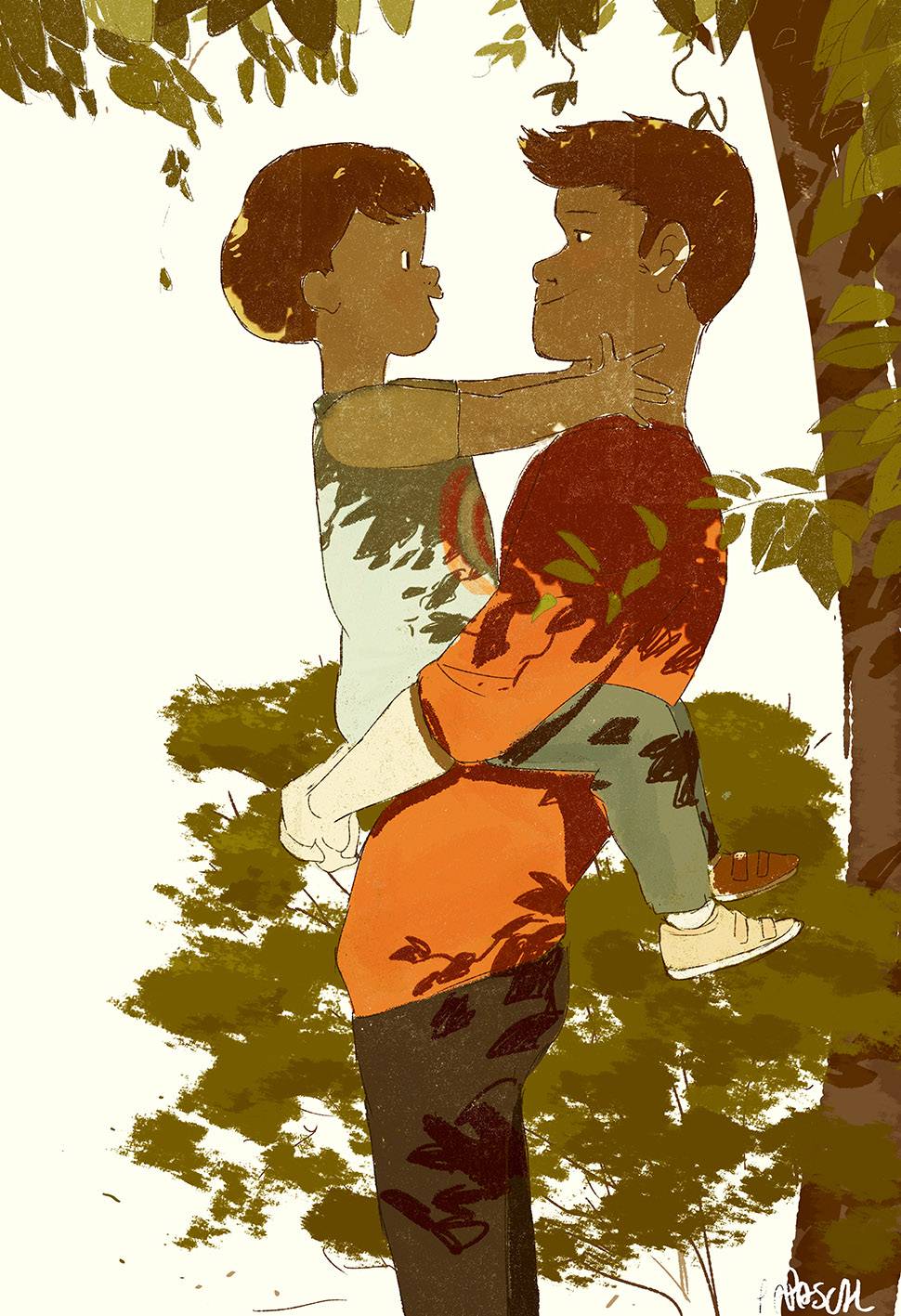 Pochi giorni fa, mio figlio mi ha chiesto della morte e allora ci ho realizzato una piccola storia sopra. Nell’immagine, stiamo camminando nel bosco, cosa che avrei voluto fare un sacco quando ero bambino, ma non ho illustrato il momento in cui mio figlio parlava. La situazione descritta, però, è abbastanza fedele a quello che stavamo facendo.