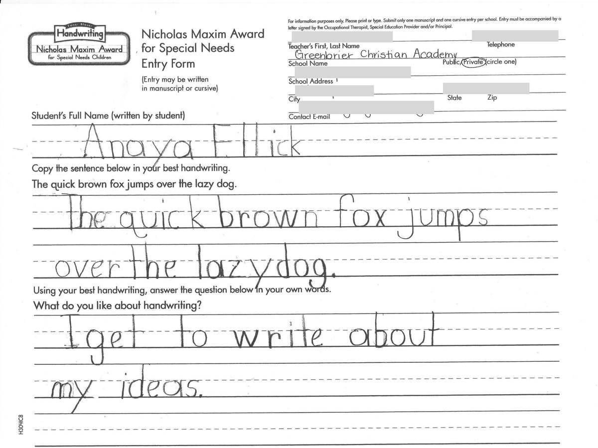Anaya Ellick è una bambina di 7 anni, nata senza mani. Questo però non le ha impedito, tenendo accuratamente una matita tra i suoi polsi, di imporsi nel concorso organizzato annualmente dall’azienda a fini educativi Zaner Bloser.