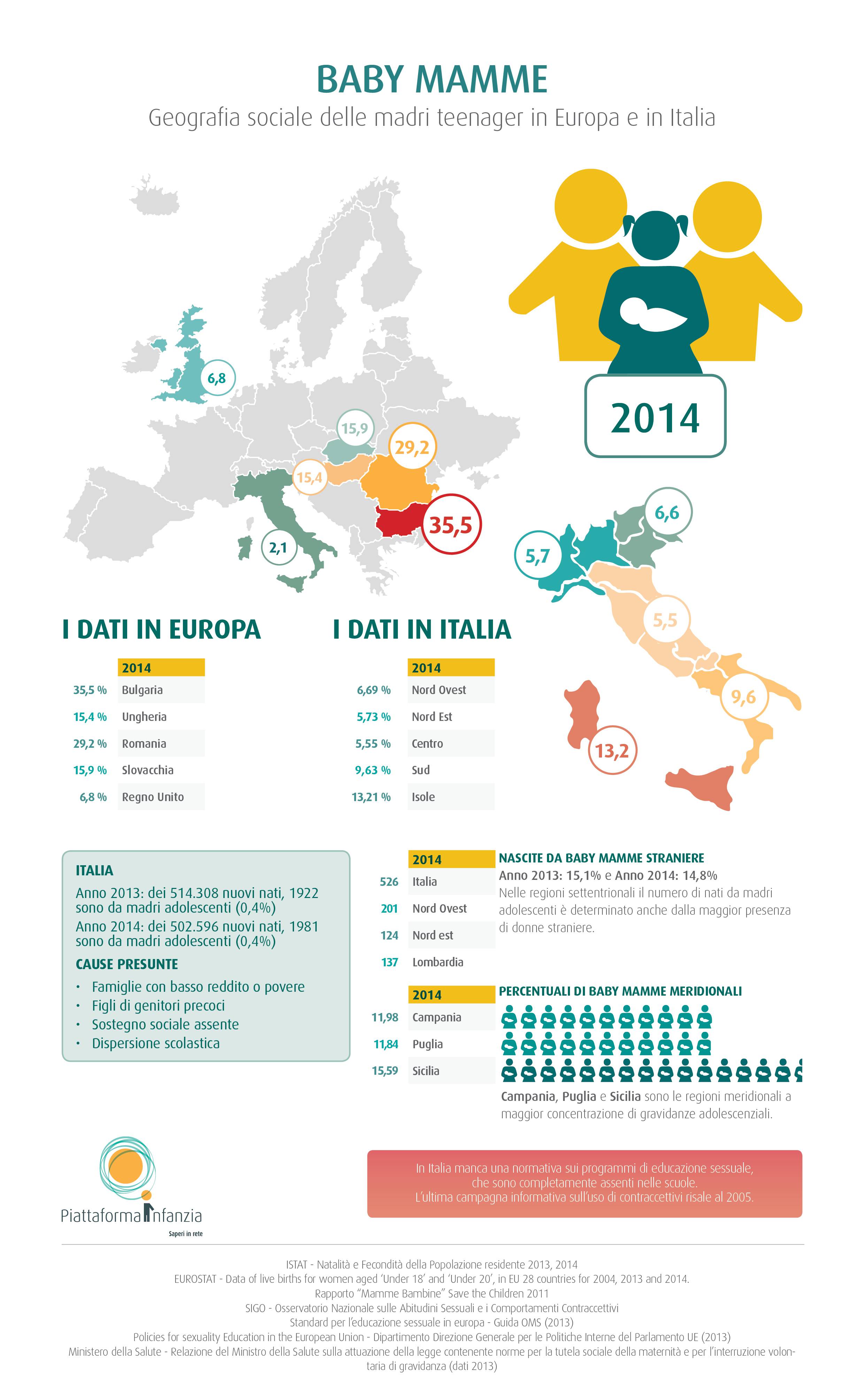 Per baby mamme si intendono le giovani che affrontano la maternità in una fascia d’età che va da 13 a 19 anni. Il picco si registra intorno ai 15-16 anni.