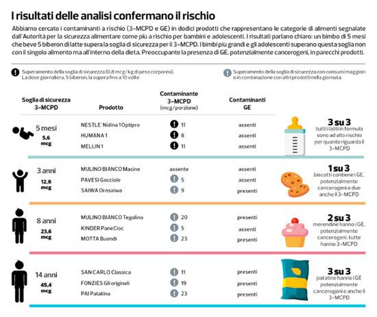 “La stima della media e le esposizioni elevate al monocloropropandiolo (sia 3-MCPD che 2-MCPD) per le fasce di età più bassa, adolescenti compresi (fino a 18 anni di età), superano la dose giornaliera tollerabile e costituiscono un potenziale rischio per la salute”.