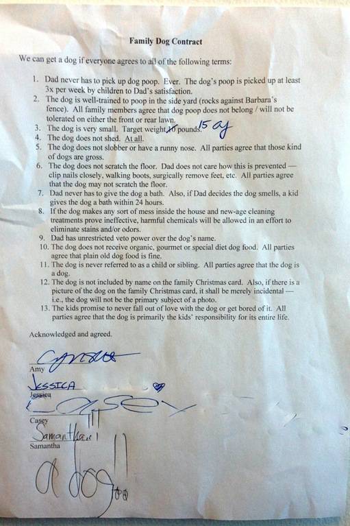 Un papà inglese però ha avuto un’idea molto simpatica e brillante. L’uomo ha scritto un contratto per prendere un cane, poi pubblicato su Reddit ricevendo numerosi commenti.