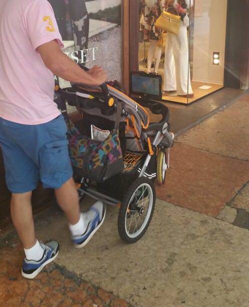 “Visto ora, sotto il Pavaglione, passeggino porta iPad con cartoni animati per bambino di poco più di un anno. Penso sia eccessivo. Cosa ne pensate?”