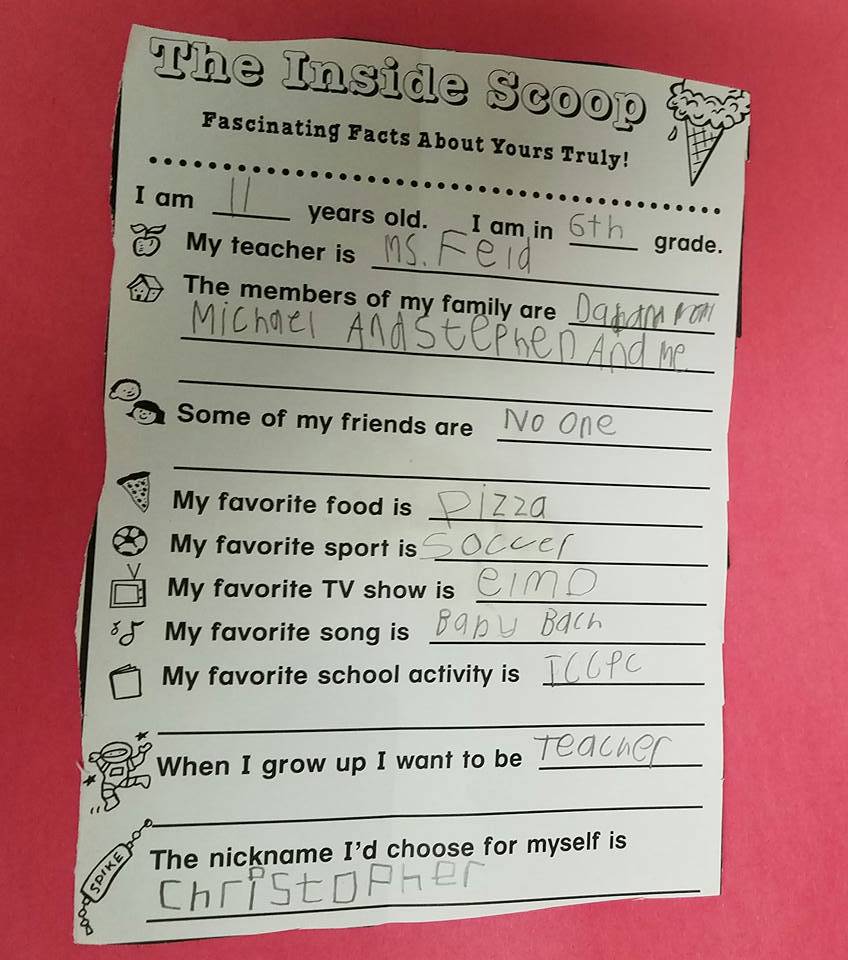 ” per chi non lo sa, Christopher, il mio figlio più piccolo, è nello spettro dell’autismo, sono andato alle sue spalle durante la scuola notturna di giovedì e ho scattato un’immagine di uno dei suoi progetti in mostra sul muro, una delle tante cartoline piuttosto carine che tutti i bambini della sua classe avevano riempito. Veniva chiesto loro di elencare i cibi preferiti, lo sport, i programmi tv, ecc...
