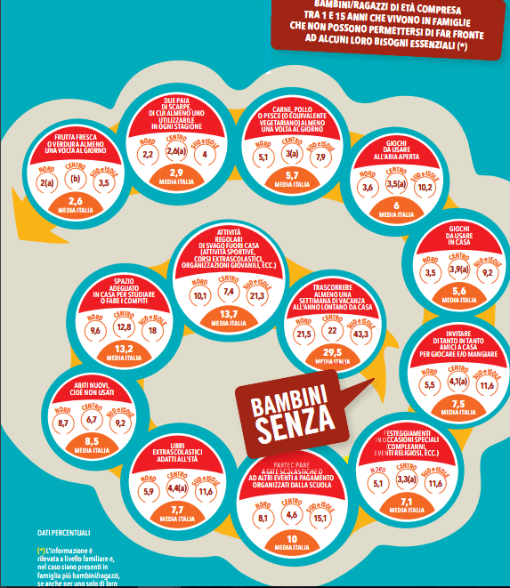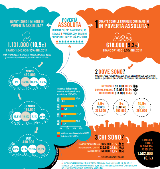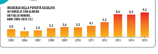 In Italia 1 bambino su 10 e quasi 1 famiglia con bambini su 10 vivono in povertà assoluta. La percentuale ammonta al 9,3%. Nel 2006 era dell’2%.