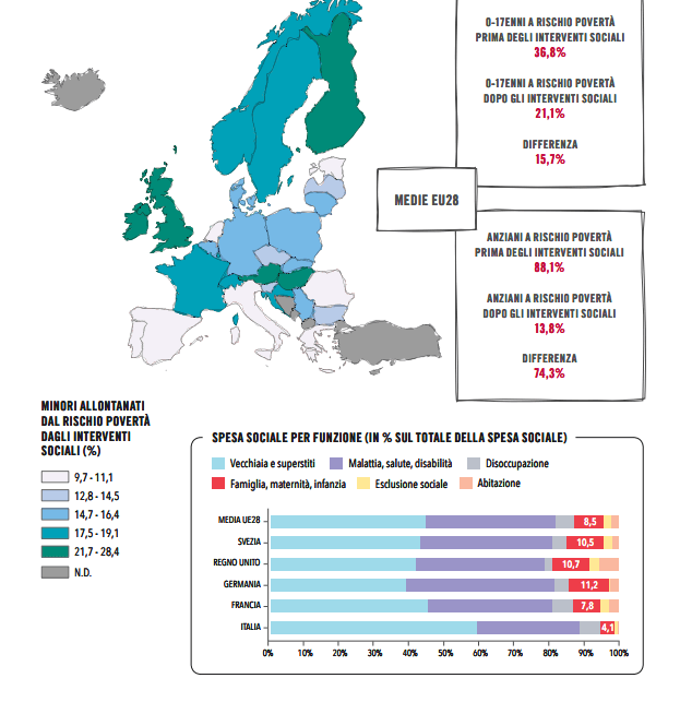 Secondo le stime l’Italia investe nella protezione sociale di ogni individuo quanto l’Europa ma il nostro welfare non riesce ad ottenere gli stessi frutti nella lotta alla povertà e all’esclusione minorili.