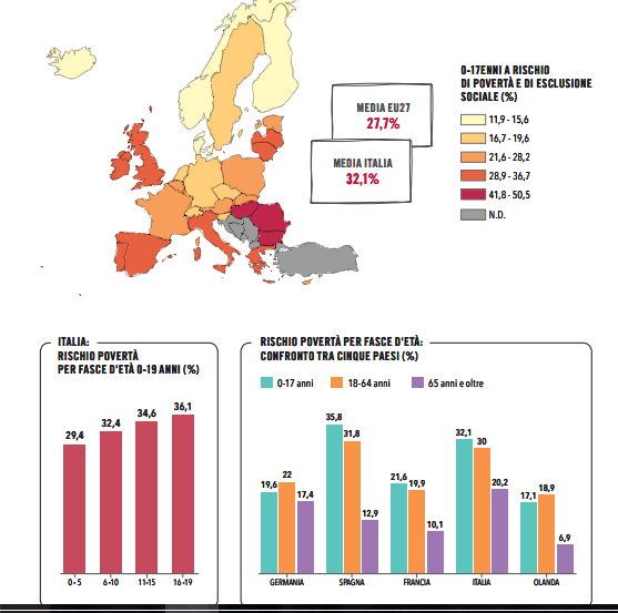 1 minore su 3 è a rischio di povertà ed esclusione sociale, significa il 32,1% del totale, una percentuale importante e che stride invece con la media europea del 27,7% e con quella di alcuni Paesi europei in cui il welfare funziona decisamente meglio.