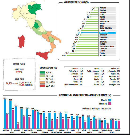 La percentuale di giovani che hanno abbandonato l’istruzione superiore, in generale, è diminuita. Sono però i maschi quelli con la percentuale più alta di dispersione scolastica.