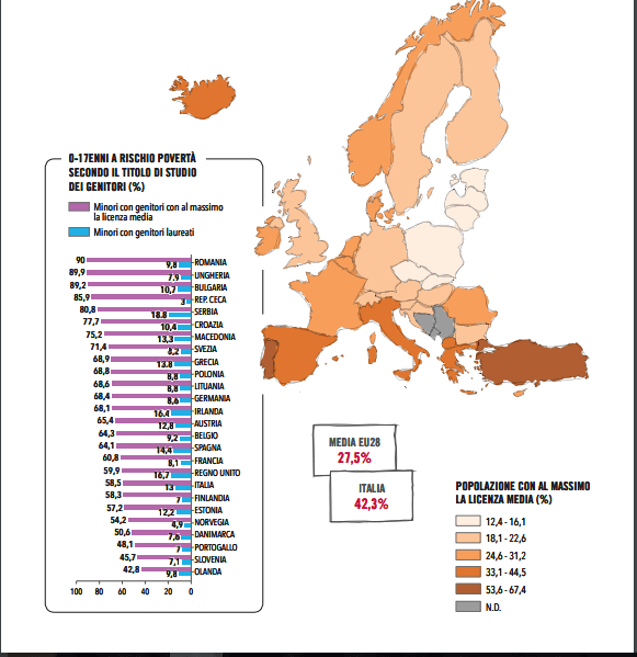 In Italia la percentuale di adulti con livelli di scolarizzazione inferiori rimane molto elevata, è di circa 15 punti sotto la media europea. I bassi titoli di studio ricadono poi sui figli: