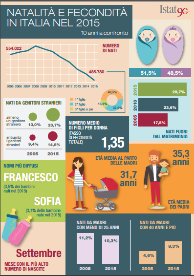 Fonte: IstatCare unimamme, come ogni anno l’Istat ha pubblicato il rapporto su “Natalità e Fecondità della popolazione residente” in Italia per l’anno 2015, e i dati non sono incoraggianti: sono infatti stati iscritti all’anagrafe 485.780 bambini (circa 17 mila in meno del 2014 e 91 mila dal 2008).