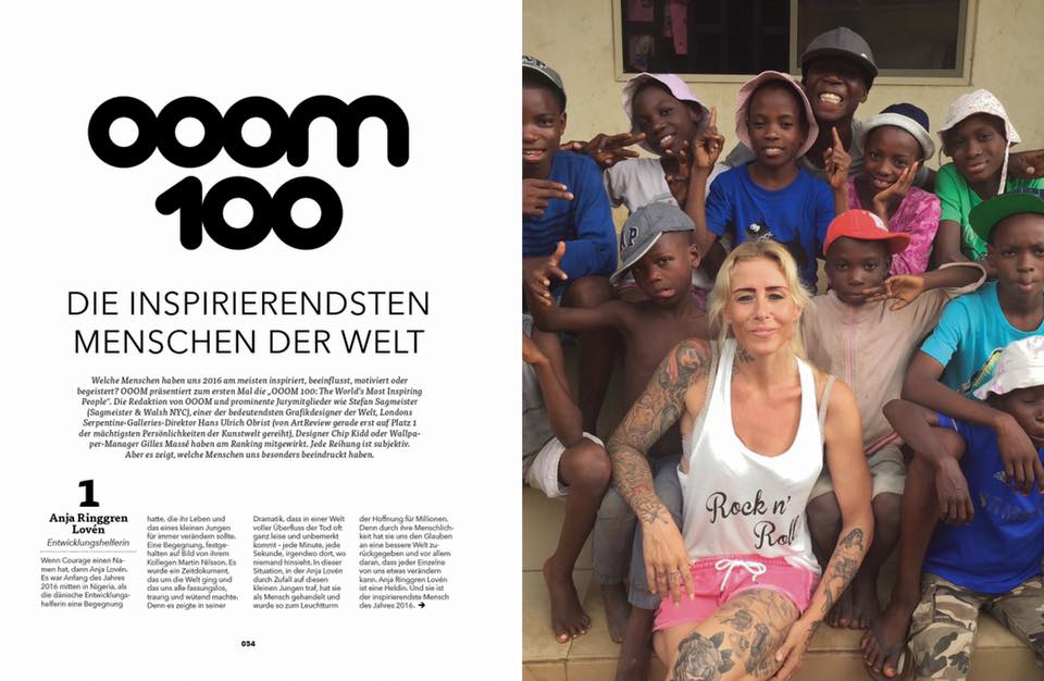 Georg Kindel, capo editore di OOOM aggiunge: “Anja è una luce di speranza e la persona capace di ispirare di più nel 2016. Quando ha visto quel bambino che moriva di fame ha agito come un essere umano ed è diventata fonte di ispirazione per milioni di persone. I suoi sforzi per aiutare e sostenere i bambini abbandonati della Nigeria ci danno speranza e ci incoraggiano a seguire il suo esempio”.