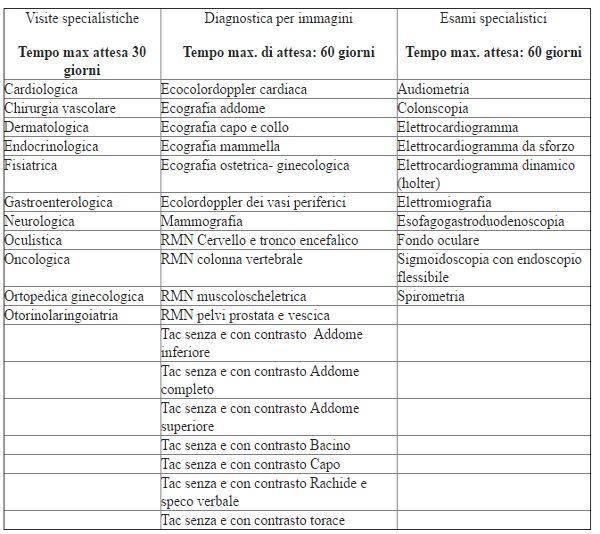 Gli esami compresi sono (58 in totale), per la maggior parte, strumentali, come la tac, tra cui si segnalano: consulti cardiologici, oculistici, neurologici, ortopedici e devono essere garantiti almeno al 90% dei cittadini che li richiedono.