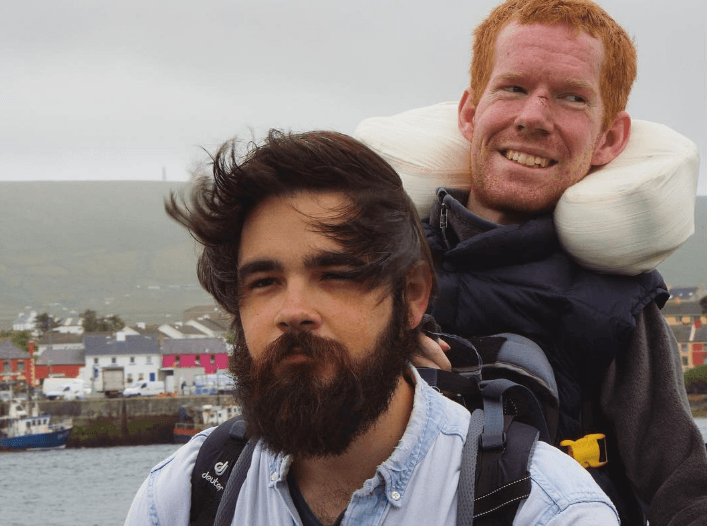 A questo punto sono intervenuti i suoi amici che hanno realizzato uno zaino speciale con cui hanno trasportato Kevan attraverso Irlanda, Francia e Inghilterra.