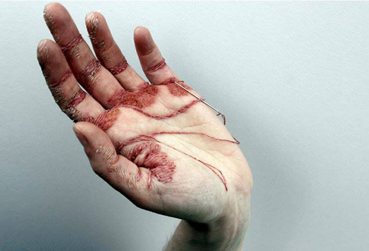 Per realizzare il suo progetto, che porta il nome di A Woman’s Work is Never Done (Il lavoro di una donna non finisce mai), Eliza Bennett ha usato la propria mano come materiale di base considerandola una tela su cui cucire come con ago e filo, dando così origine a una mano logorata dal lavoro.