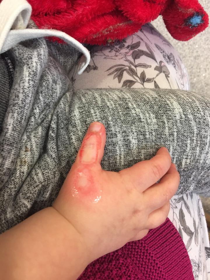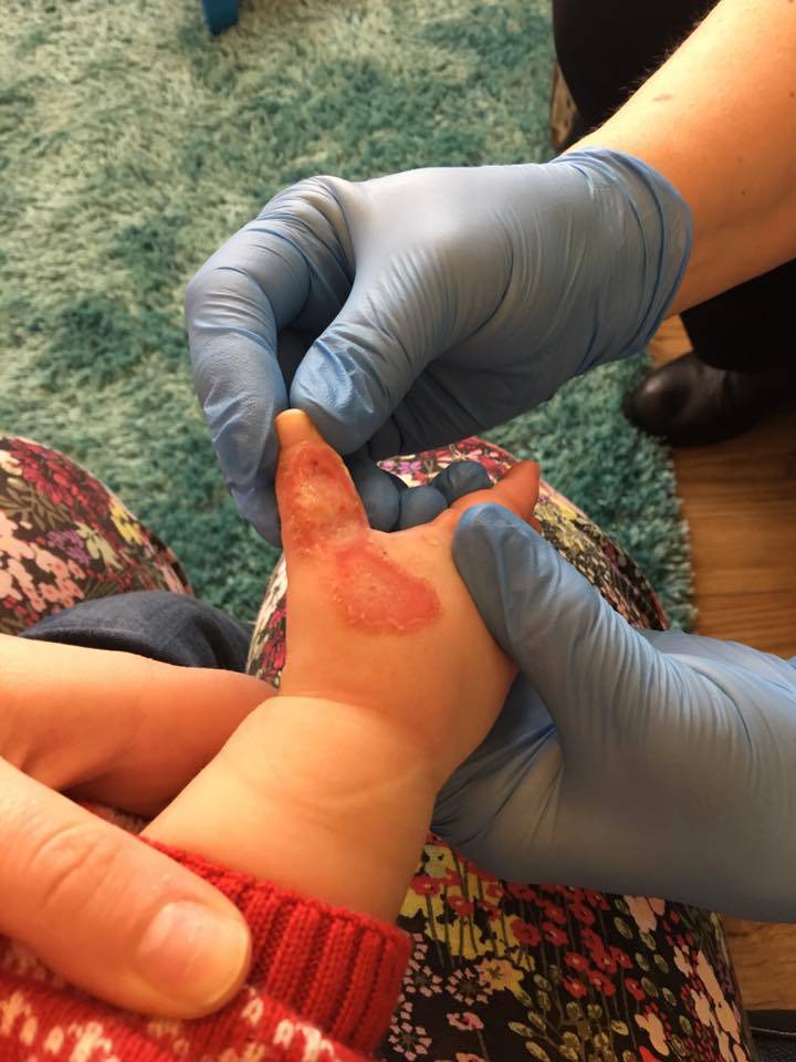 L’ho portato immediatamente all’unità per i traumi minori (con gli occhi piangenti e pieni di panico) pensando che saremmo stati medicati e mandati via! Ma così non è stato, siamo infatti stati mandati il giorno dopo al Bristol Childrens’ Hospital per incontrare specialisti di ustioni e chirurghi plastici, con una ustione di 4° grado e possibile compromissione del tendine. Ci hanno parlato della possibilità di cicatrici serie e movimenti limitati crescendo, hanno pulito l’ustione e dobbiamo rimedicarla ogni 3 giorni e un appuntamento con gli specialisti una volta a settimana!