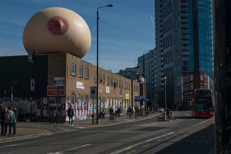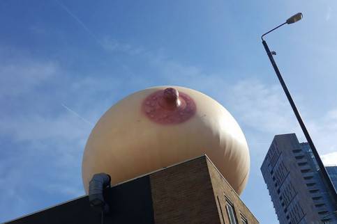A Londra, nel quartiere di Shoreditch, in occasione della festa della mamma, un seno gigante gonfiabile, con tanto di capezzolo bene in vista, è apparso sulla cima di un palazzo della capitale britannica.